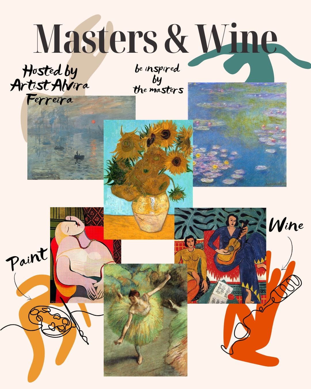 From Monet’s peaceful waterlilies and vibrant seascapes, to Van Gogh’s expressive florals, Degas’ graceful ballerinas, Matisse’s joyful shapes, and Picasso’s abstract faces — you’ll find a style that speaks to you. This is a space to explore, enjoy, and express yourself without pressure — with a glass of wine in hand.
