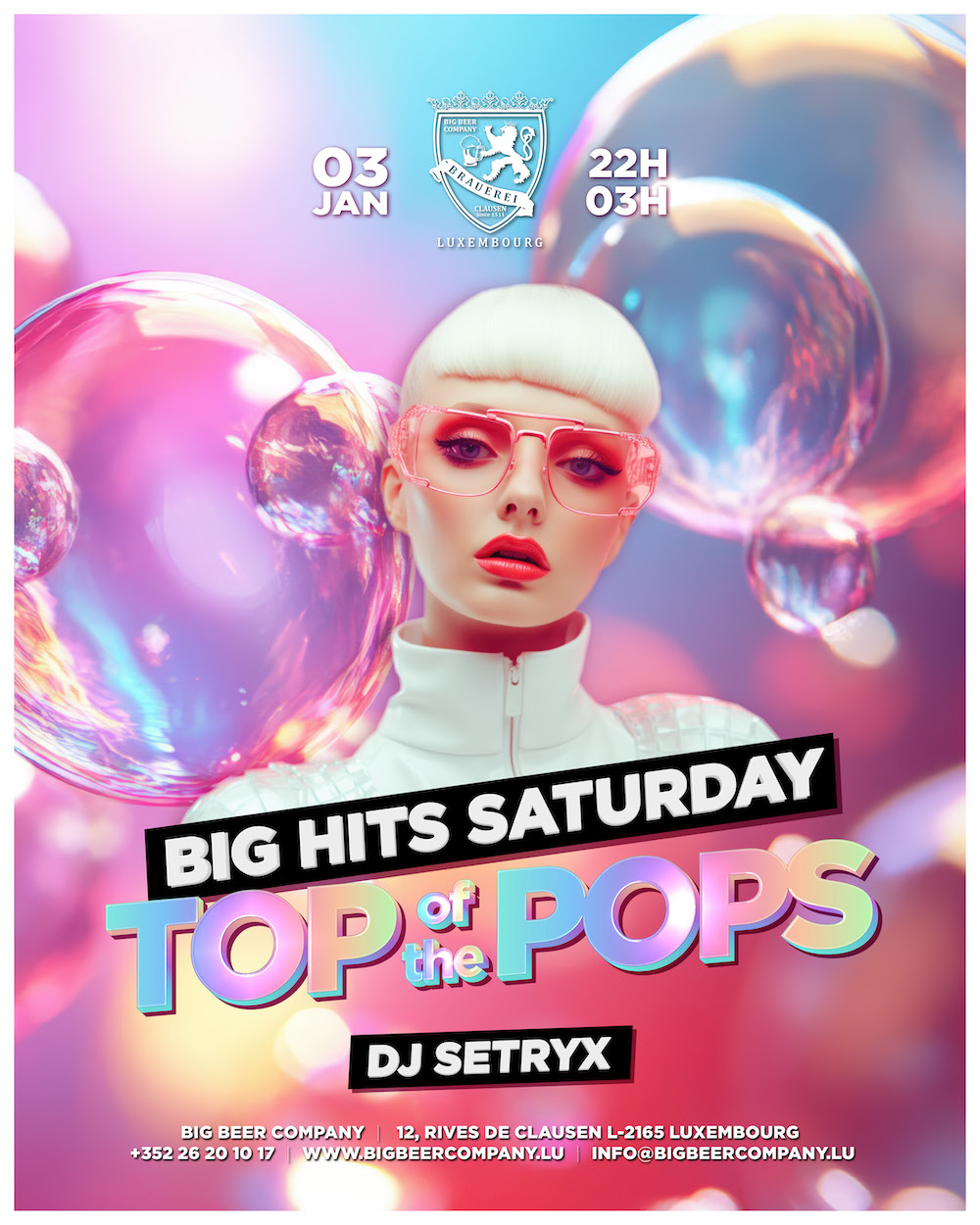 • 2026-01-03 22:00:00 2026-01-03 23:00:00 Europe/Paris Big hits saturday - Top of the pops SATURDAY'S BIG HITS All your favorite hits from TOP OF THE POPS, all night long! • DJ Setryx • 10:00 p.m.–3:00 a.m. Sing loudly, dance even louder, enjoy the weekend! Big Beer Company, Rives de Clausen, Grund, Luxembourg Big Beer Company