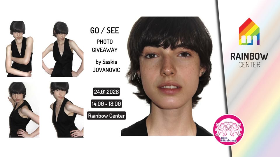 • 2026-01-24 14:00:00 2026-01-24 18:00:00 Europe/Paris GO'N'SEE Photo Giveaway by Saskia JOVANOVIC This project captures people as they are. No styling. No performance. No correction. Each person enters alone. The camera is direct and frontal. The reference is the mugshot – neutral, stripped, and unapologetic. The image is not made to please or to explain. It documents people’s presence. Faces and bodies are treated equally. Differences appear through posture, gaze, tension, and time. What matters is not expression, but existence in the frame. FORMAT Each person has 15 minutes. - 1× close-up portrait - Tight, frontal, unfiltered. - 1× collage of four half-body images - Repetition reveals variation. The body becomes information. INTENTION This is not about representation. It is about being seen briefly, honestly, without control. All are welcome—come as you are! 19, rue Saint Esprit, 1475 Luxembourg, Luxembourg Rosa Lëtzebuerg