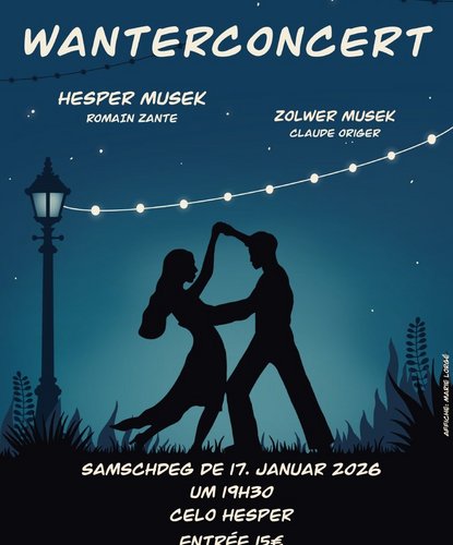 • 2026-01-17 19:30:00 2026-01-17 21:30:00 Europe/Paris Winter Concert The Harmonie municipale de Hesperange (conducted by Romain Sante) and the Harmonie de Soleuvre (conducted by Claude Origer) invite you to the winter concert. 474 Rte de Thionville, 5886 Alzingen Hesperange, Luxembourg Gemeng Hesper