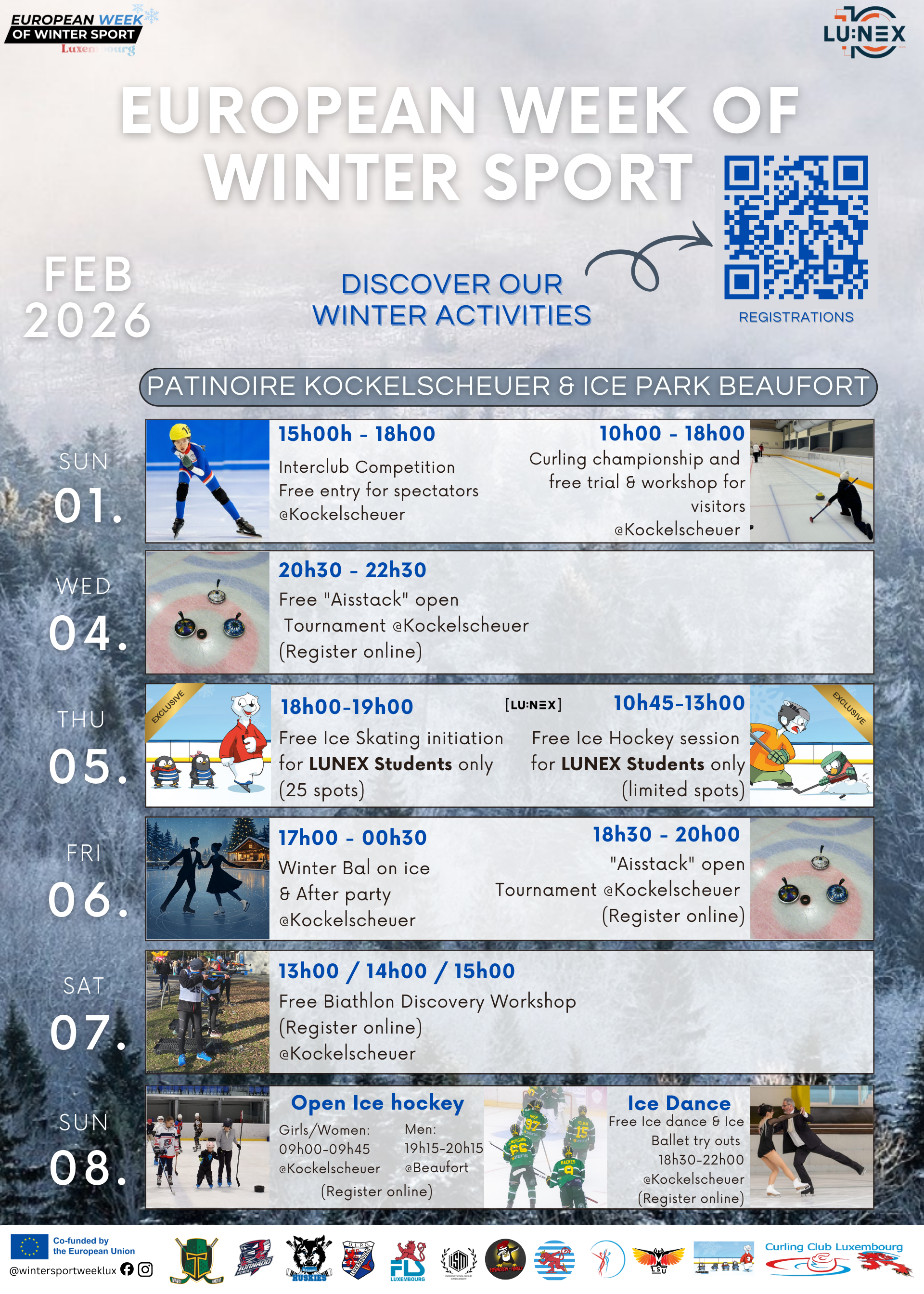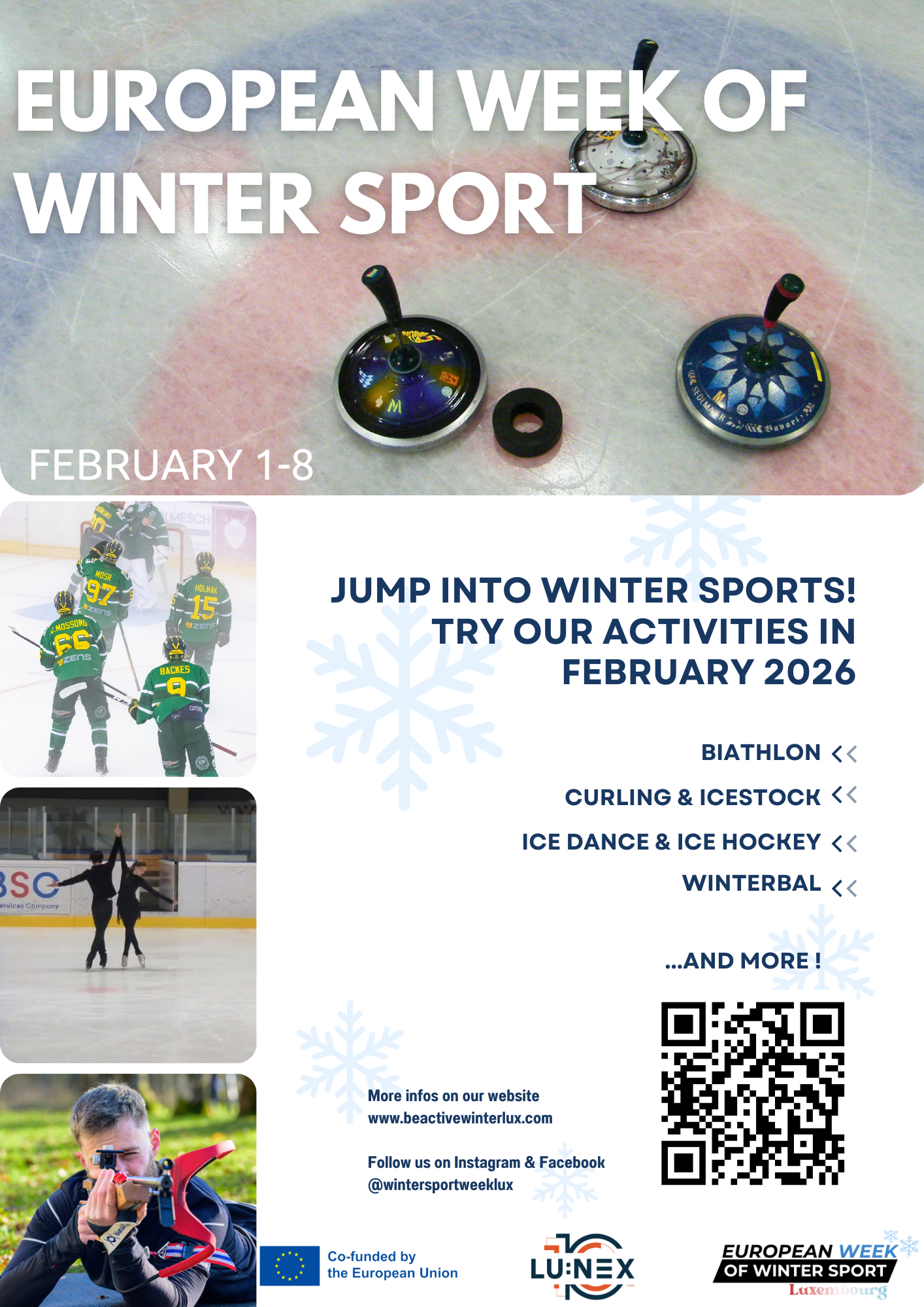 BeActiveWinterLux invites you to the European Week of Winter Sport, a thrilling event hosted in February in Luxembourg and across Europe.Immerse yourself in a world of ice-filled adventures, exciting competitions, and a vibrant atmosphere that celebrates the spirit of our Winter Sport.