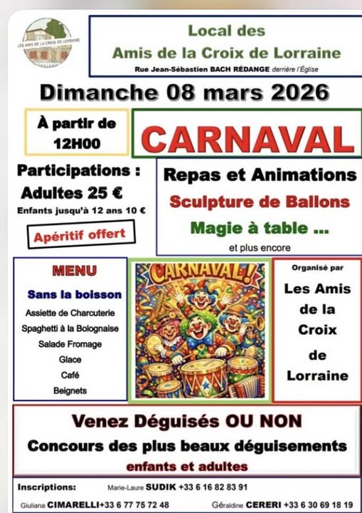 • 2026-03-08 2026-03-08 Europe/Paris Carnival Meals and entertainment, balloon sculpting, table magic and more... Come in costume or not! Best costume contest. Rue Jean Sébastien Bach Rédange 57390 FRANCE Pays Thionvillois Tourisme