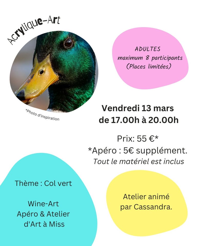 Artist Cassandra Bizzini invites you to explore acrylic painting in an immersive workshop dedicated to naturalistic and animal representations. The mallard duck, a symbol of elegance and freedom, will be the focus of this artistic experience. The workshop is open to everyone, from beginners to artists wishing to improve their technique. You will discover the basics of acrylic painting and create your own artwork.