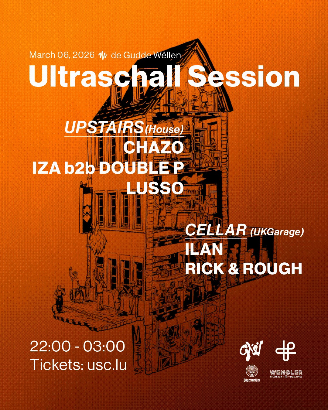 • 2026-03-06 22:00:00 2026-03-06 23:00:00 Europe/Paris Ultrasound Session We are starting 2026 with a Full House Takeover at De Gudde Wëllen On March 6th, we’re taking over one of our favorite intimate venues for a night built around multiple electronic music genres, energy and pure dancefloor moments. Expect a strong line-up spread across 2 floors, moving from deep and groovy house upstairs to fast-paced rhythms in the cellar. Upstairs: 22:00 – 00:15 Lusso 00:15 – 01:45 Chazo 01:45 – 03:00 IZA b2b Double P Cellar: 23:00 – 01:30 Ilan 01:30 – 03:00 Rick & Rough Tickets are very limited and we can’t guarantee box office, so don’t wait too long. 17 Rue du Saint Esprit, Ville-Haute Luxembourg Ultraschall Collective