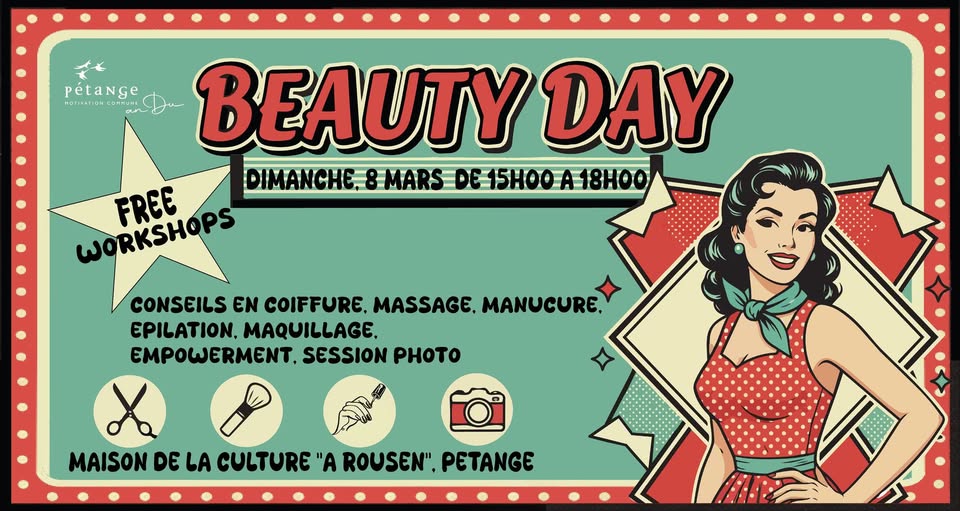 • 2026-03-08 15:00:00 2026-03-08 18:00:00 Europe/Paris Beauty Day for International Women's Day Let's celebrate together the beauty, strength, and confidence of women! Enjoy a day dedicated to well-being, beauty, and empowerment: Hairdressing & Trichology: - Scalp diagnosis - Personalized advice - Demonstrations of care - New trends and haircut ideas for 2026 Nails & Beauty: - Express manicure - Hand massage - Lip care - Facial hair removal (wax & threading) - Everyday makeup workshop Photo session to immortalize this unique moment. Massage Workshop: - Short head, back or hand massages to relax and recharge your energy Women's Empowerment: - Boost your self-confidence and explore your femininity – dare to be a woman! Let yourself be pampered! 3 Place du Marché, 4756 Pétange, Luxembourg Commune de Pétange