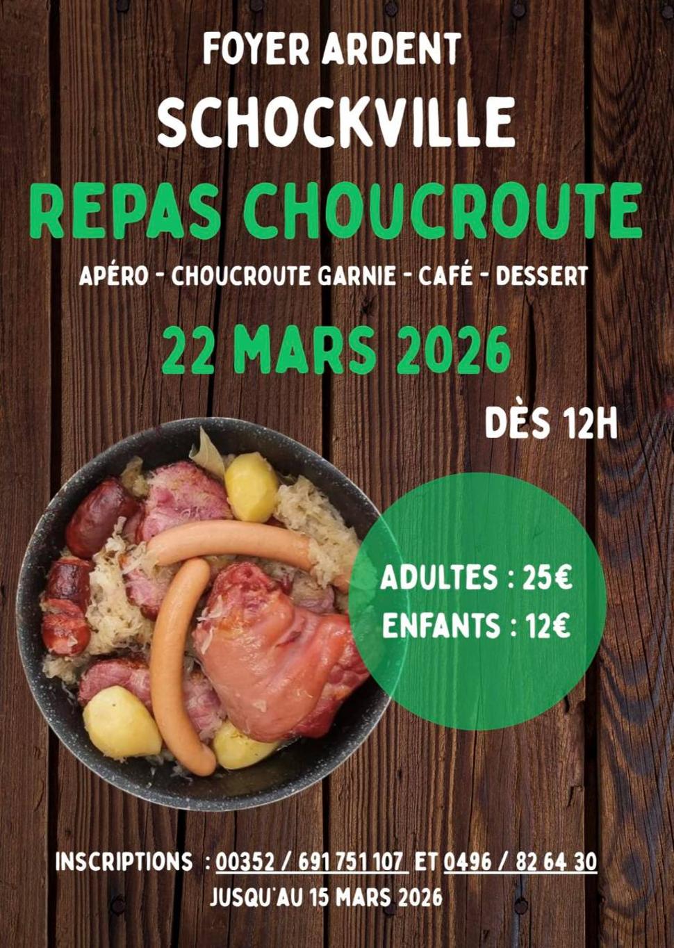 • 2026-03-22 12:00:00 2026-03-22 13:00:00 Europe/Paris Sauerkraut meal On the program: - Aperitif - Garnished sauerkraut - Coffee - Dessert Schockville, 6717 Attert, Belgique