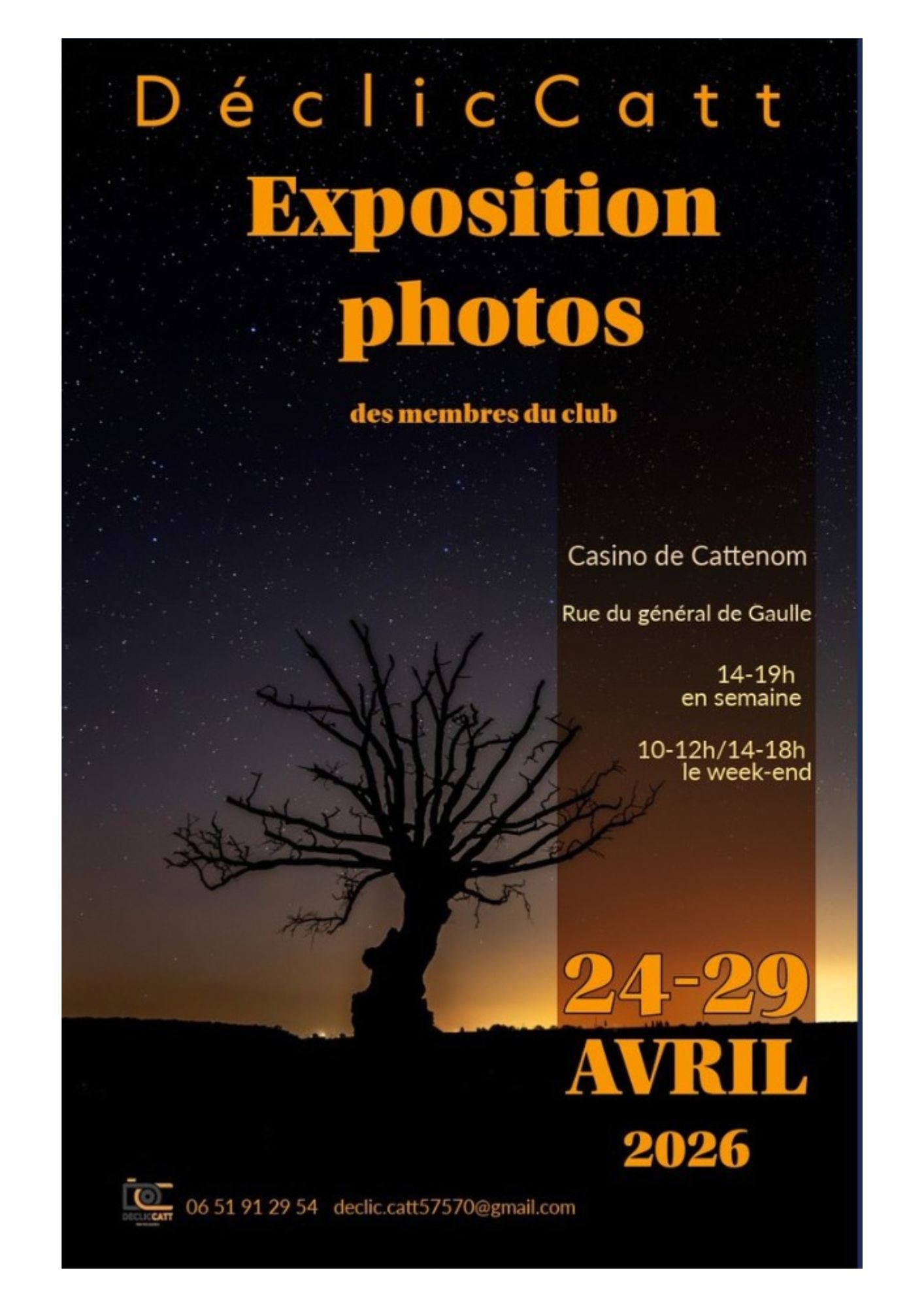 • 2026-04-24 2026-04-29 Europe/Paris Déclic’Catt photo exhibition The photographers of Déclic’Catt present their creations. Through a wide variety of subjects, styles, and sensibilities, club members share their perspective on the world and invite the public to take time to explore each image. Portraits, landscapes, everyday scenes, or more artistic explorations: this exhibition highlights the club’s diverse photographic approaches and the joy of taking pictures. It's a great opportunity to discover the work of local enthusiasts and be surprised by their worlds. Avenue du Général de Gaulle, 57570 Cattenom, France Pays Thionvillois Tourisme