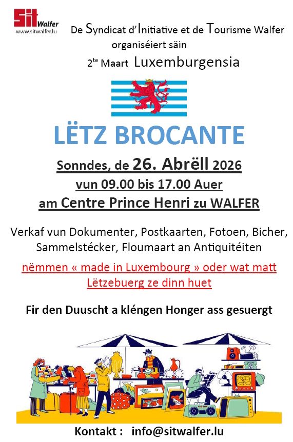 Sale of documents, postcards, photographs, books, collectibles, second-hand goods and antiques exclusively "Made in Luxembourg" or related to Luxembourg.