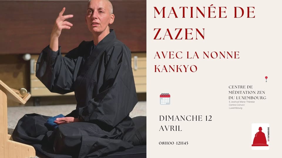 • 2026-04-12 06:45:00 2026-04-12 11:45:00 Europe/Paris Zazen morning with nun Kankyo To deepen the practice, a morning is organized for all who attend the dojo, whether regularly or not. Nun Kankyo will offer various Buddhist practices on the theme of the Earth. To register for the full morning, you must have already attended a zazen session in our dojo. A meditation discovery workshop is offered at 9:45 a.m. for beginners. 5, avenue Marie-Thérèse, Centre Convict, Luxemburg, Luxemburg Méditation zen sōtō Luxembourg