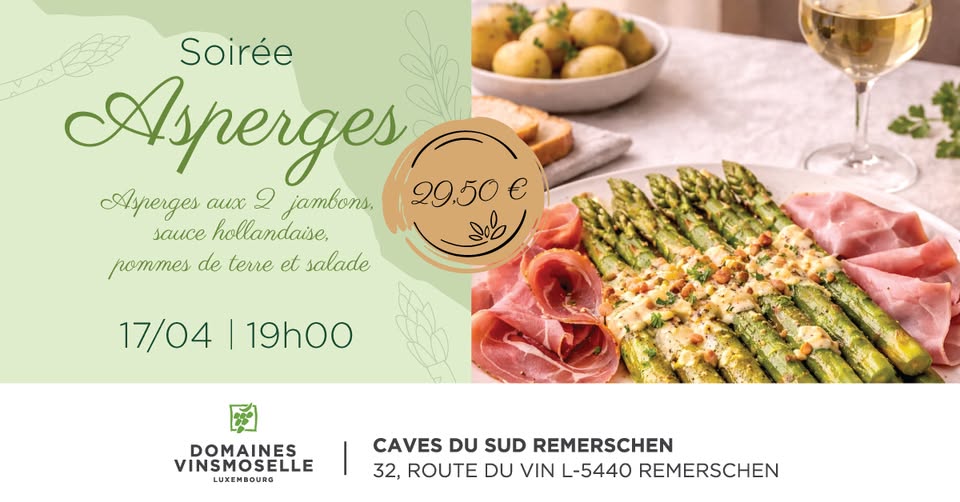 • 2026-04-17 18:00:00 2026-04-17 19:00:00 Europe/Paris Asparagus Evening Join us for a delicious evening dedicated to asparagus! The menu includes asparagus with two types of ham, hollandaise sauce, potatoes and salad, accompanied by a selection of wines and Crémants. Non-alcoholic options are also available. 12 Route du Vin, Schengen, Remich, Luxembourg Domaines Vinsmoselle