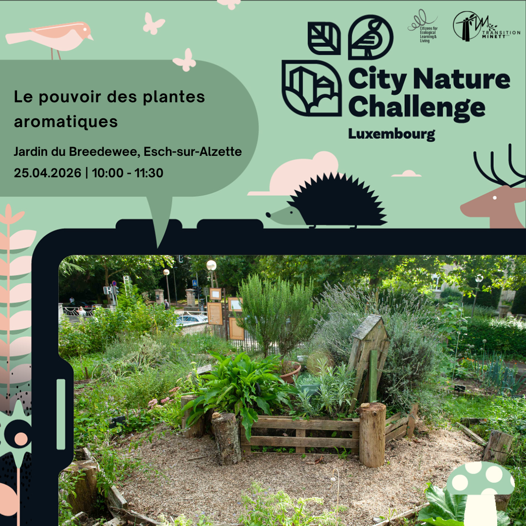 • 2026-04-25 10:00:00 2026-04-25 11:30:00 Europe/Paris Workshop: The Power of Aromatic Plants Come and discover the characteristics of aromatic plant cultivation, their usefulness for the garden and insects, and their benefits for our health. Rue Large, Esch-sur-Alzette, Luxembourg Jardin Communautaire Breedewee (en face du Parc Laval)