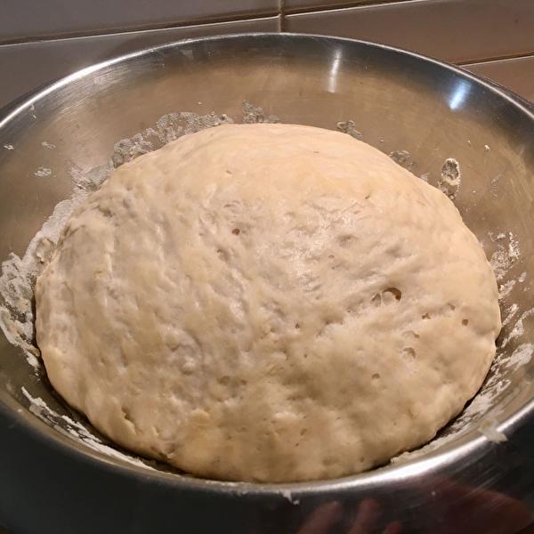 1. Préparation de la pâte : on met la farine dans un saladier. Dans un bol doseur, on fait fondre la levure dans l'eau sans laisser de résidus au fond. Puis on verse la moitié de l'eau dans la farine, on mélange avec une cuillère. Dès qu'on voit que l'eau est absorbée par la farine, on en rajoute, jusqu'à ne plus avoir d'eau. On finit par pétrir à la main. On couvre le tout avec une charlotte et, HOP, on laisse reposer entre 3 et 4h (il faut que ça double de volume).