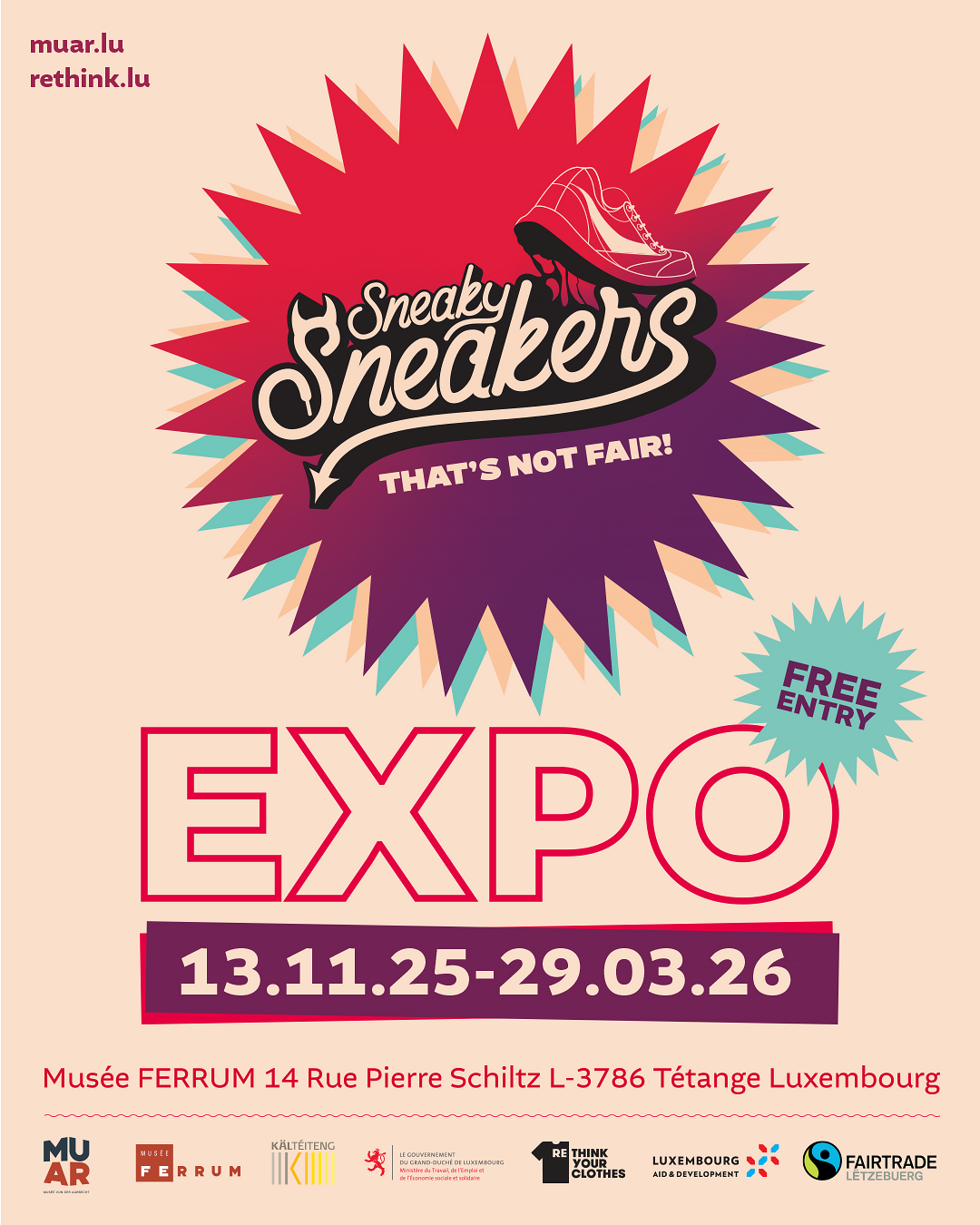 De la mode urbaine à l'expression sociale, l'exposition « Sneaky Sneakers – That's not FAIR! » explore l'essor de la basket, de son pouvoir culturel à ses conséquences cachées. À travers des récits, des objets et des installations interactives, l'exposition révèle la créativité et les défis liés à cette icône mondiale, et vous invite à repenser la mode, pour le bien de tous et de la planète !