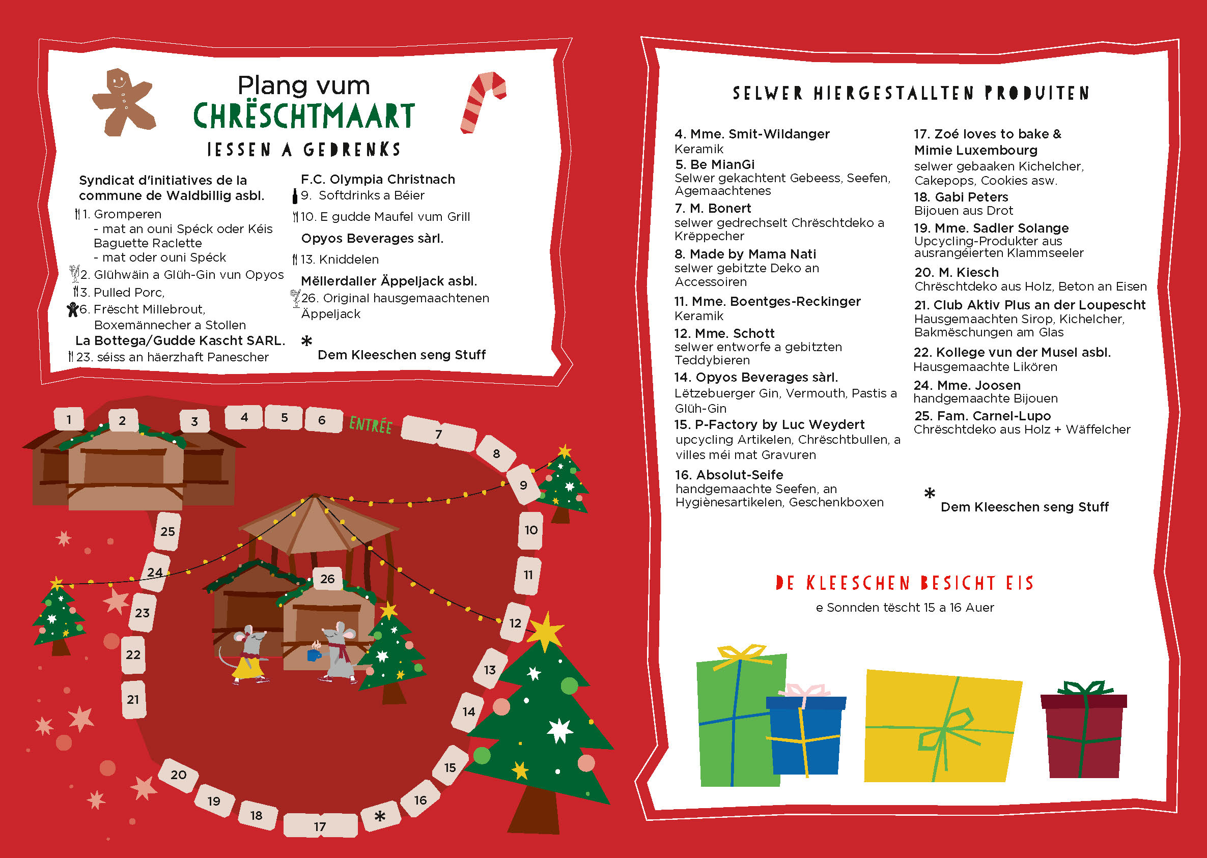 • 2025-12-06 12:00:00 2025-12-06 13:00:00 Europe/Paris Marché de Noël au moulin Heringer Marché de Noël au Heringer Millen. Vous y trouverez à coup sûr le cadeau idéal pour Noël et passerez un agréable moment ! Au menu : confiture de pommes maison, vin chaud et gin chaud ; gâteaux en boîte, stollen et millebrot cuits au four à bois ; pommes de terre au four avec ou sans bacon, grillades variées et quenelles ; décorations et cadeaux artisanaux en tissu, bois, métal, céramique… Et pour votre plus grand plaisir : gin, biscuits, sirop, liqueur, confiture et bien d’autres gourmandises. Mullerthal Waldbillig, Luxembourg Touristcenter Heringer Millen