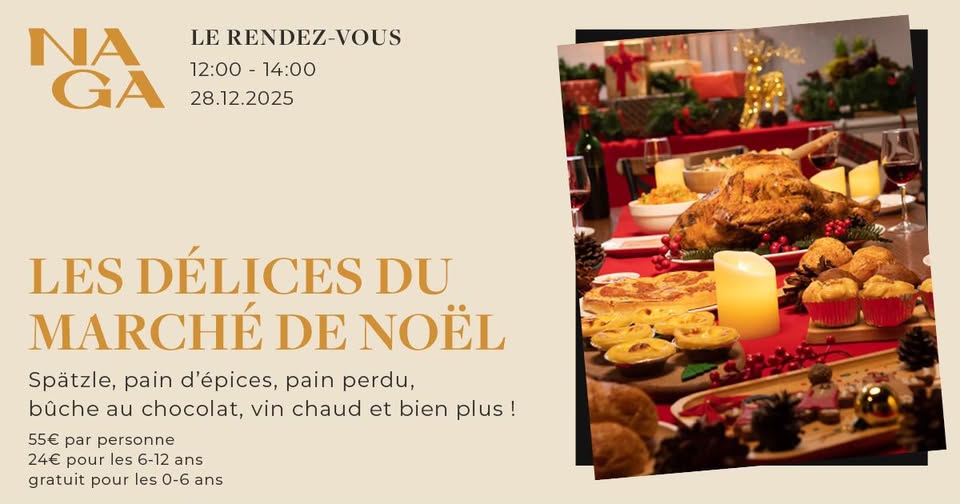 • 2025-12-28 12:00:00 2025-12-28 14:00:00 Europe/Paris Le Rendez-vous Buffet Édition spéciale : Les Délices du Marché de Noël Le Naga vous invite à découvrir un buffet plein de douceurs réconfortantes, incluant gravlax de saumon, huîtres, salade de fruits de mer, ballotine de dinde aux châtaignes, choucroute, spätzle, lardons et fromage fondu, lasagnes végétariennes, pain farci, salade de betterave, chèvre et miel, pain d'épices, pudding caramel, pain perdu, bûche au chocolat, soupe de saison, vin chaud et bien plus. Profitez de ce buffet unique et venez déguster ! 15 Rue de Limpach, 3932 Mondercange, Luxembourg Naga - Restaurant