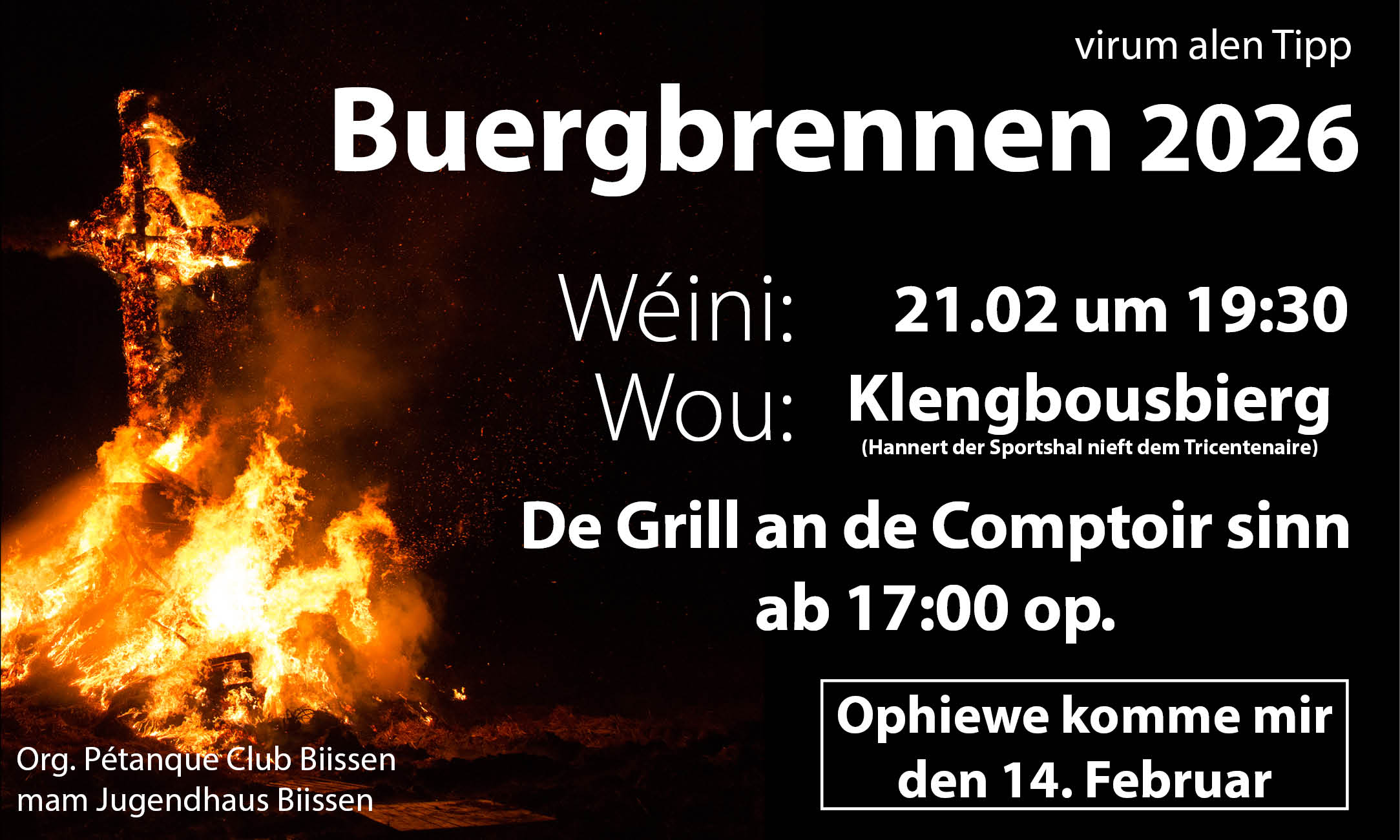 • 2026-02-21 2026-02-21 Europe/Paris Buergbrennen 2026 Buergbrennen 2026 1 Rue des Moulins, 7784 Bissen, Luxembourg Commune de Bissen / Gemeng Biissen