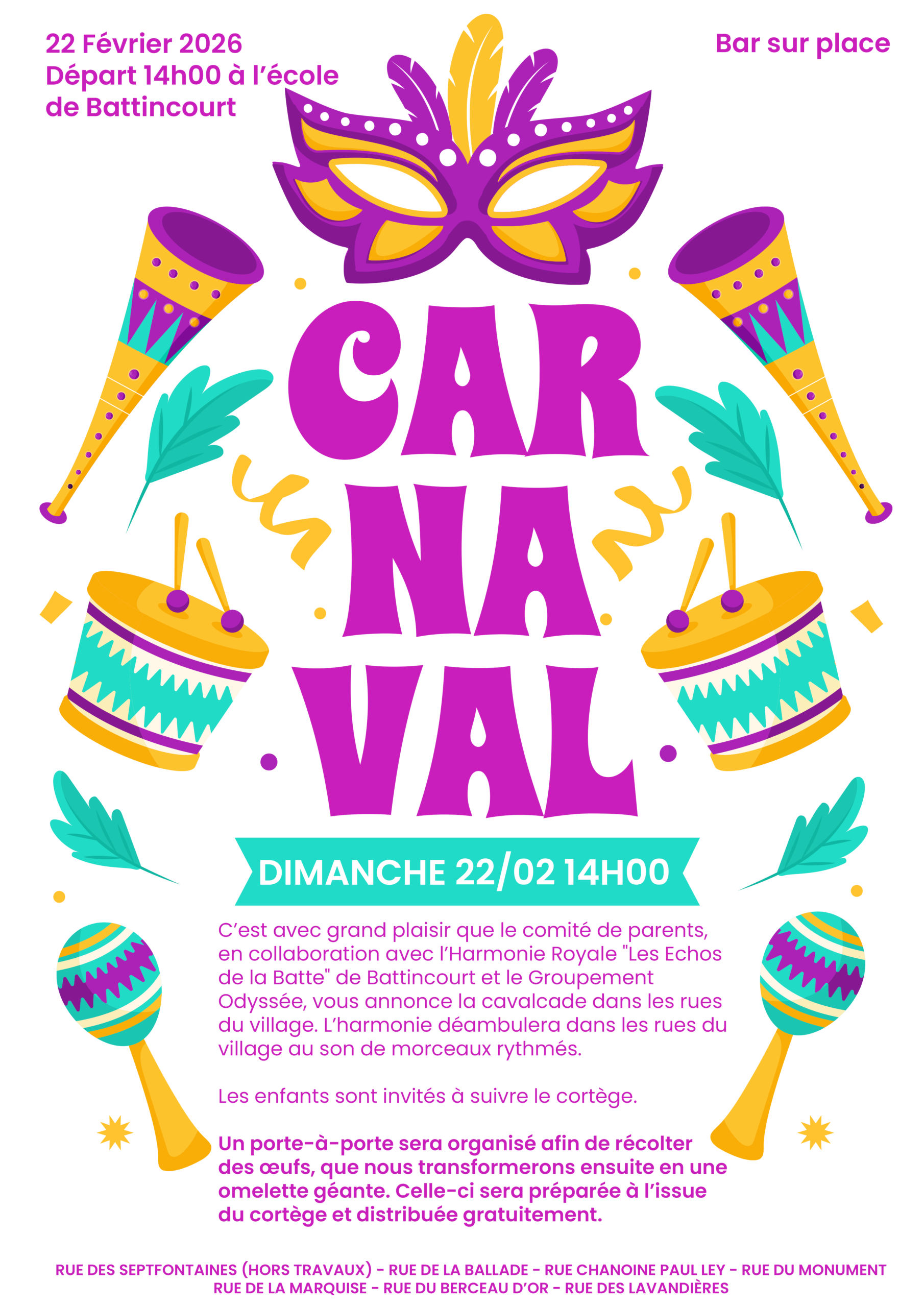 C’est avec grand plaisir que le comité de parents, en collaboration avec l’Harmonie Royale "Les Echos de la Batte" de Battincourt et le Groupement Odyssée, vous invite à participer à la cavalcade dans les rues du village. L’harmonie déambulera dans le village au son de morceaux rythmés. Les enfants sont invités à suivre le cortège. Un porte-à-porte sera organisé pour récolter des œufs, qui seront ensuite transformés en une omelette géante, préparée à l’issue du cortège et distribuée gratuitement.