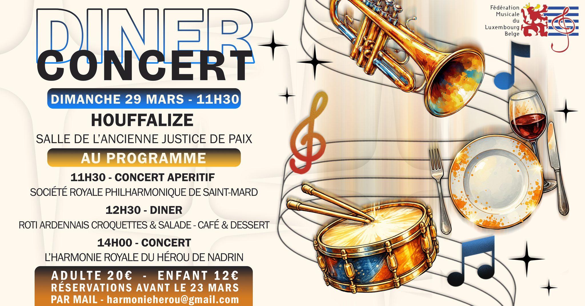 À l’occasion de l’Assemblée générale de la Fédération musicale du Luxembourg Belge, nous avons le plaisir de vous inviter à un dîner-concert organisé dans la salle de l’Ancienne Justice de Paix à Houffalize.