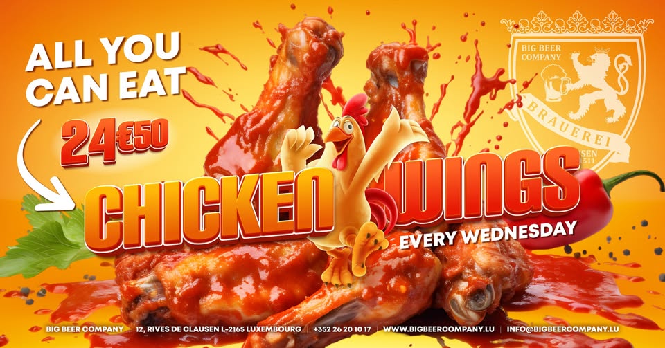 • 2026-03-11 17:00:00 2026-03-11 21:30:00 Europe/Paris All you can eat chicken wings • chaque mercredi • Big Beer Company Luxembourg Retrouvez nos célèbres ailes de poulet à volonté ! Rejoignez-nous chaque mercredi pour un festin d'ailes de poulet. Choisissez votre sauce préférée : barbecue ou épicée. 12 Rives de Clausen, 2165 Luxembourg, Luxembourg Brauerei - Big Beer Company