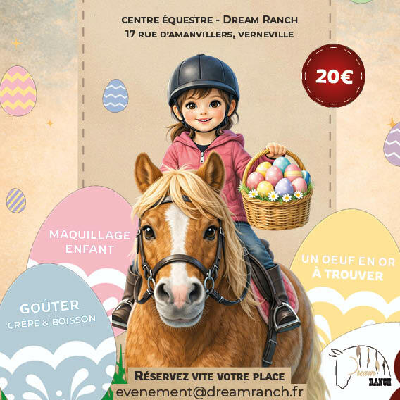 • 2026-04-04 13:15:00 2026-04-04 14:15:00 Europe/Paris Grande chasse aux trésors de Pâques à Poney ! Le lapin de Pâques a semé la pagaille dans les écuries… Cette année, les enfants ne feront pas qu’une simple chasse aux œufs… Ils partiront pour une véritable chasse au trésor à dos de poney! Une aventure magique les attend : Retrouver les morceaux d’une carte aux trésors Partir en balade à poney pour explorer le ranch Relever des défis amusants Découvrir où le lapin de Pâques a caché ses chocolats Bonus: un œuf en or est caché L’enfant qui le trouvera remportera une surprise spéciale Au programme: - Balade à poney - Atelier maquillage - Goûter (boisson + crêpe) - Chocolats pour les enfants 17 Rue d'Amanvillers, 57130 Vernéville, France Centre équestre Dream Ranch