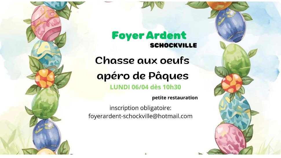 Le Foyer Ardent de Schockville vous invite à une grande chasse aux œufs à la salle du village, ouverte aux enfants ainsi qu'aux parents. Retrouvez votre âme d'enfant dans une ambiance conviviale, suivie d'un apéritif.