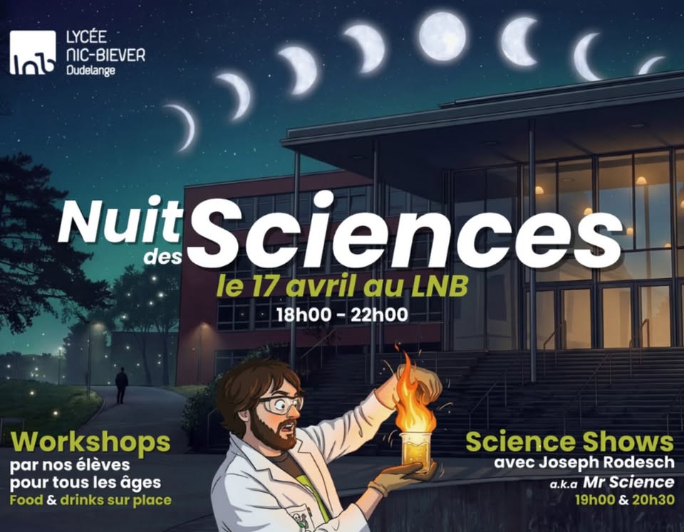 Vous êtes cordialement invités à la Nuit des Sciences ! Attendez-vous à une soirée passionnante et interactive pour petits et grands : Joseph Rodesch, alias Mr Science, présentera deux spectacles spectaculaires, et les élèves du LNB proposeront une série d'ateliers originaux et ludiques où vous pourrez participer activement.