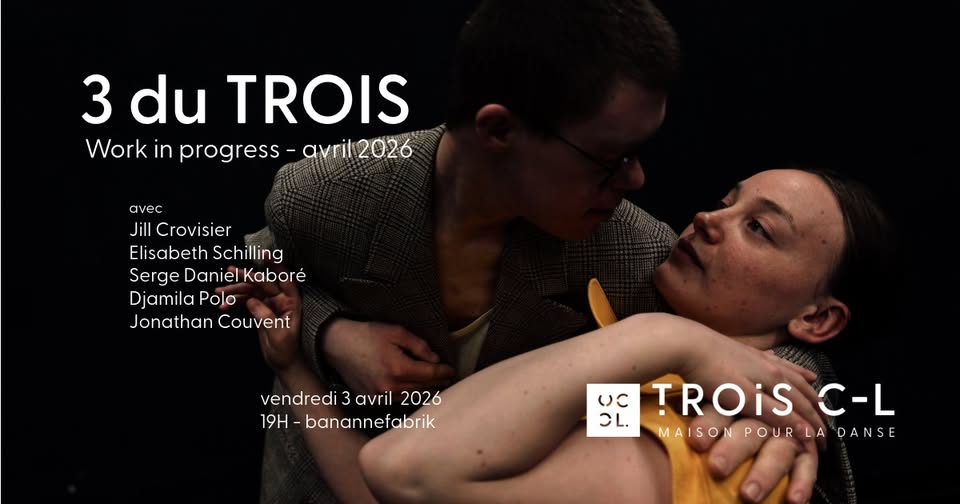 Le troisième jour de chaque mois, le TROIS C-L | Maison pour la danse organise les "3 DU TROIS", un rendez-vous culturel proposant une programmation artistique pluridisciplinaire qui interroge la société et les arts chorégraphiques. Lors de ces soirées, des artistes présentent leur travail et leur réflexion à l’issue d’une période de résidence ou de recherche. Ce sont des occasions de découvrir la danse contemporaine sous différents angles, dans une ambiance conviviale et propice à l’échange avec les artistes.
