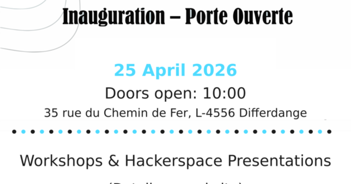 Nous sommes ravis de vous annoncer l'inauguration officielle de notre tout nouveau hackerspace, Warp3, à Differdange. Après avoir déménagé de Bonnevoie à Differdange, nous avons terminé l'installation et avons hâte de célébrer ce nouvel espace avec la communauté.